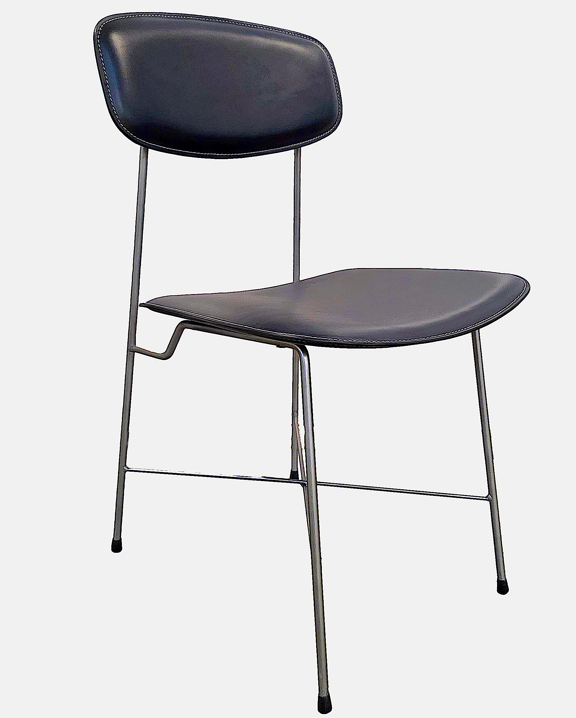 La sedia Coslin ha la struttura in sottile tondino d'acciaio laccato nero opaco o color acciaio. La seduta e lo schienale in legno curvato sono imbottiti e rivestiti in cuoio pieno fiore (click colori) con cuciture a contrasto, oppure in velluto Blossom (click colori) o in altri tessuti, anche forniti dal cliente.