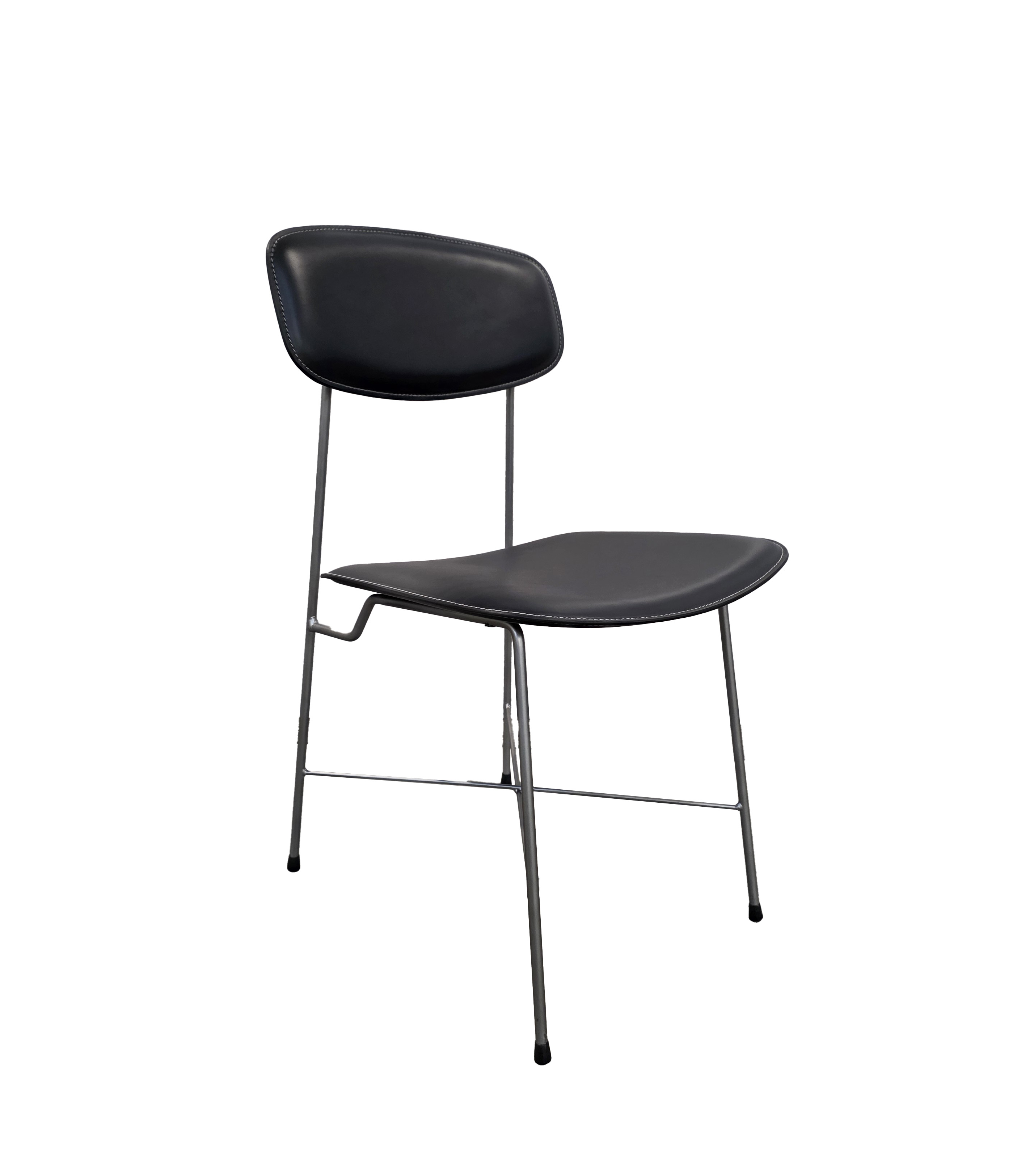 La replica dedia sedia Coslin ha la struttura in sottile tondino d'acciaio laccato grafite o color acciaio. La seduta e lo schienale in legno curvato sono leggermente imbottiti e rivestiti in cuoio pieno fiore (click colori) con cuciture a contrasto, in velluto (click colori) o altri tessuti, anche forniti dal cliente.